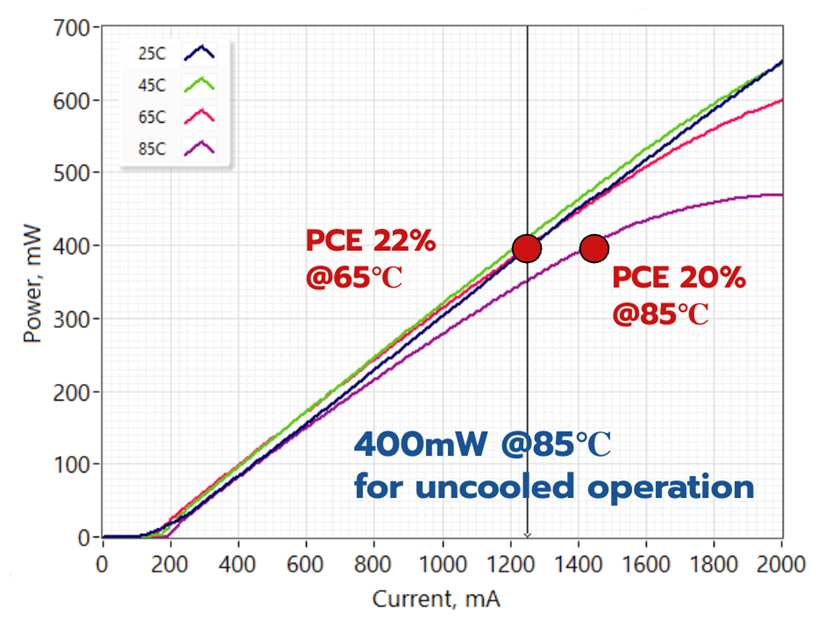 Alexey Kovsh展示了基于InAs/GaAs 量子點技術的DFB激光器,它們擁有世界紀錄級別的功率。該激光器可在高達100℃的非制冷環境中工作,85℃時的PCE為20%,從而解決了共封裝光學平臺對外部光源(ELS)的TEC需求問題。這正是目前市場所需要的,因為到目前為止基于量子阱高功率DFB激光器都需要使用TEC,從而導致ELS能耗增加,系統可靠性下降。