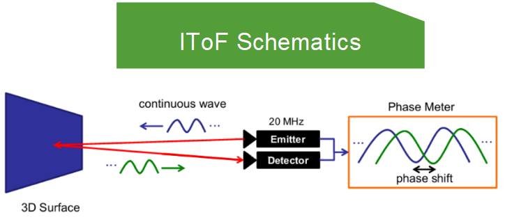 DToF 是一種直接飛行時間方法。它是一種通過獲取光子的往返飛行時間來計算相機與場景之間距離的測量方法。 DToF 和 IToF 之間的原理在發射光和反射光方面有所不同。 DToF 很簡單,就是發出一個光脈沖,測量光脈沖發射和反射之間的時間間隔,從而獲得飛行時間。