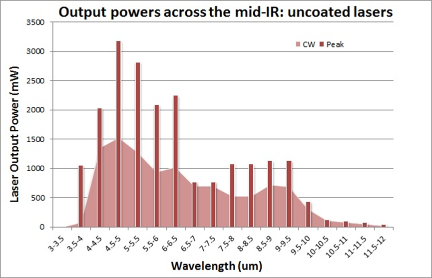 AdTech 的QCL產品幾乎完全覆蓋了從 3.8μm 到 12.5μm 的波長范圍。我們的大部分器件都能夠在室溫下連續運行,并且可以通過制造DFB實現單模發射,或制造廣域器件,用于高功率應用。