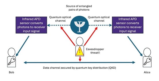 在量子密鑰分發(fā)(QKD)系統(tǒng)中,通過光通道傳輸量子比特可實現(xiàn)安全通信(圖 3)。InGaAs APD在檢測QKD中用作量子比特的單光子方面發(fā)揮著重要作用。它們的高響應度和低噪聲特性使其成為確保量子通信系統(tǒng)安全和可靠的理想選擇。